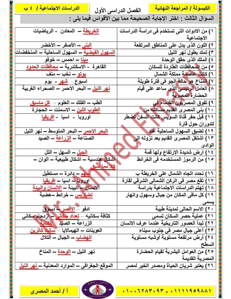 س و ج مراجعة دراسات للصف الرابع الابتدائي ترم اول 2020