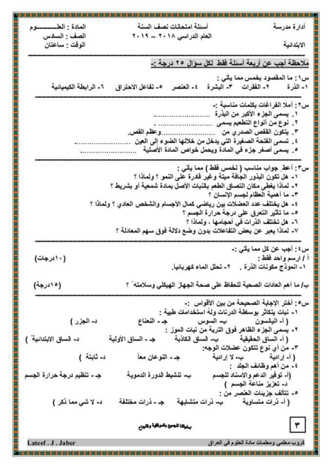 نماذج أسئلة علوم للصف السادس الإبتدائي نصف السنة ٢٠١٩ للأستاذ لطفي جابر منتديات درر العراق