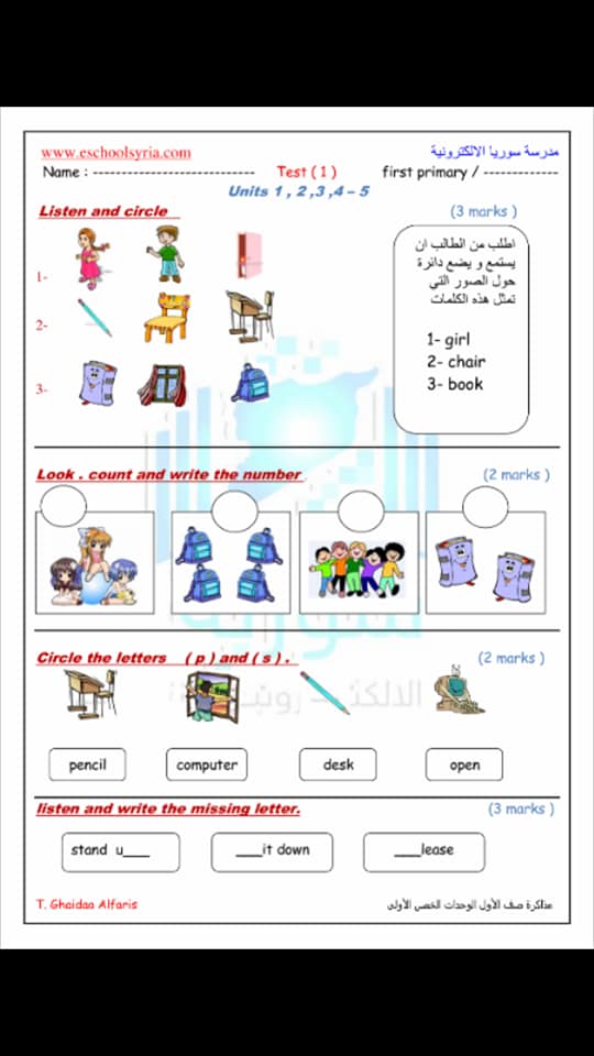 اللغة الانكليزية نماذج مذاكرات الوحدات من 1 الى 5 الصفوف من اول الى رابع الفصل الاول 2018 2019